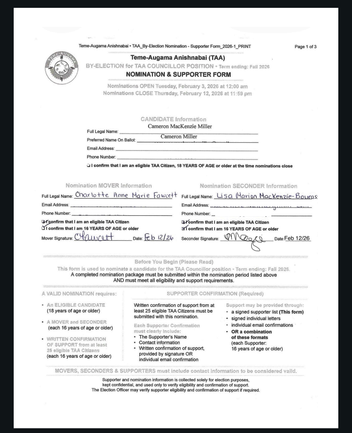 By-Election Councillor Announcement TAACommunications February 16, 2026 Uncategorized TAA_FEB_2026_BY-ELECTION_Councillor_Announcement_v1B[2]Download Screenshot_Nomination_Mover_Seconder_Redacted_copy[1]Download Screenshot_Nomination_Mover_Seconder_R_copyDownload TAA_By-Election_Nomination-Supporter_Form_2026_RECORD_v_1[1]Download Related Post navigation Previous Previous post: February 2026 Negotiations UpdateNext Next post: Biboon Maawanjihidiwin- Winter Assembly. See you There!